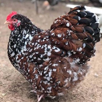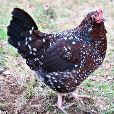 Speckled Sussex Chickens are a dual-purpose breed primarily used for egg production. They are an active and curious bird that lay 180-240 large light brown eggs per year. Roosters generally weigh 9lbs and hens 7lbs. The breed originated in England and is APA recognized. They are shown in the English Class. Speckled Sussex Chickens tend to go broody.