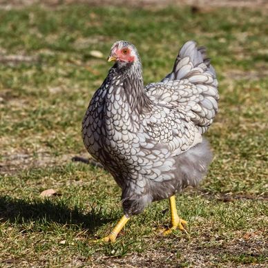Delaware Chickens are a dual-purpose breed primarily used for egg production. They are a docile bird that lay 180-260 large to jumbo brown eggs per year. Roosters generally weigh 8.5lbs and hens 6.5lbs. The breed originated in Delaware, US and is APA recognized. They are shown in the American Class. Delaware Chickens tend to go broody.