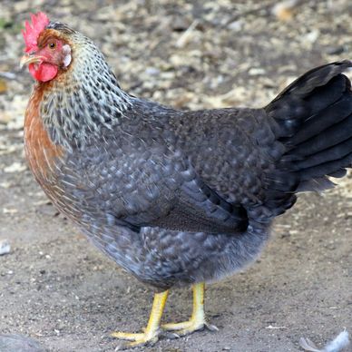 Blue Laced Red Wyandotte Chickens are a dual-purpose breed primarily used for egg production. They are a docile bird that lay 180-260 medium brown eggs per year. Roosters generally weigh 8.5lbs and hens 6.5lbs. The breed originated in the United States and is not APA recognized. They are shown in the American Class. Blue Laced Red Wyandotte Chickens tend to go broody.